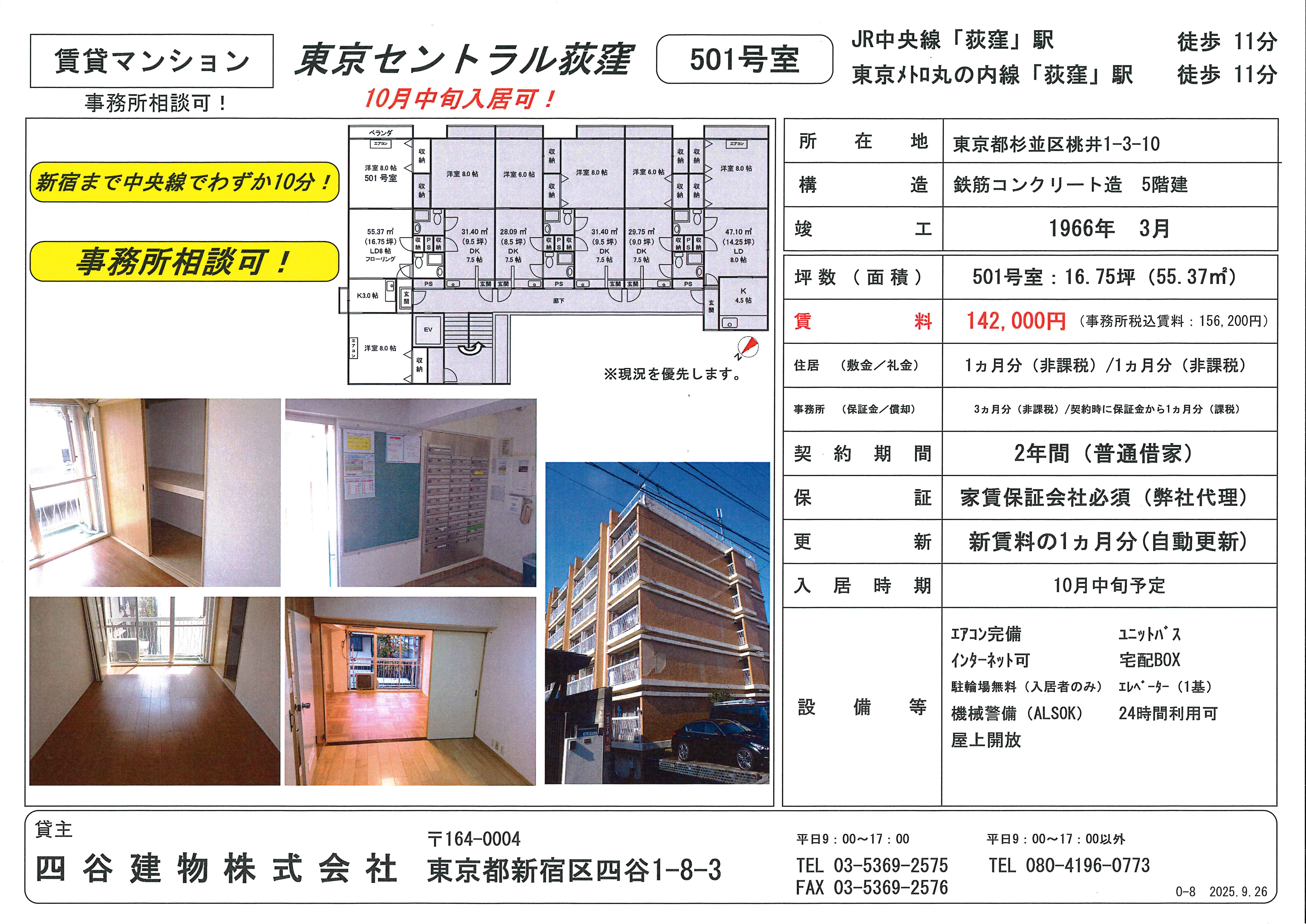 【お問い合せ】TEL:03-5369-2575 【営業時間】 9:00~17:00(土日祝休) 空室情報 ※画像を右クリックして、「新しいタブで画像を開く」から開いた画面で印刷が可能です。 東京セントラル荻窪 501号室 501号室 専有面積 16.75坪(55.37㎡) 賃料 142,000円(税抜) 用途 住居 ※事務所相談可 新宿まで中央線でわずか10分! 事務所相談可! 物件所在地