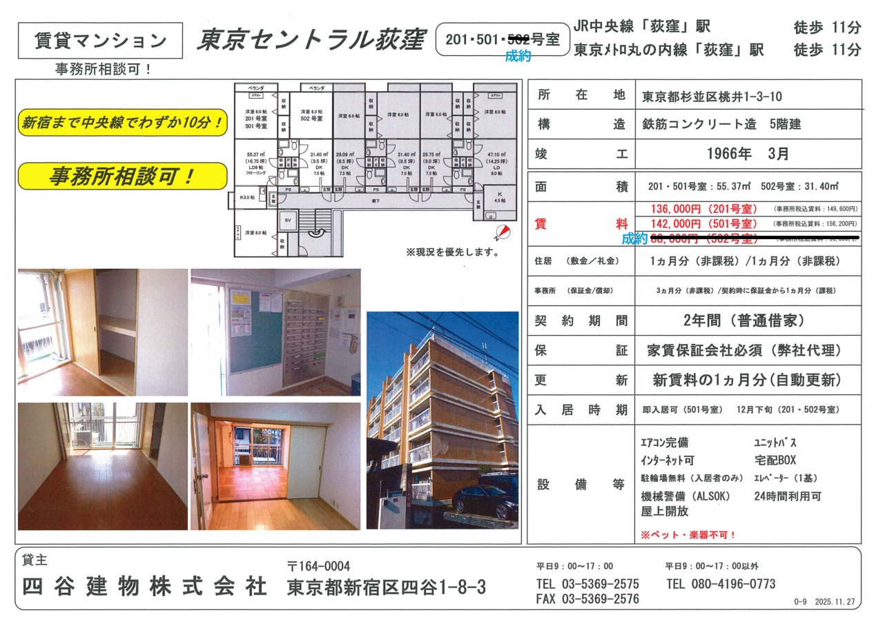 【お問い合せ】TEL:03-5369-2575 【営業時間】 9:00~17:00(土日祝休) 空室情報 ※画像を右クリックして、「新しいタブで画像を開く」から開いた画面で印刷が可能です。 東京セントラル荻窪 201・501号室 201号室 専有面積 55.37㎡ 賃料 136,000円(税抜) 用途 住居 ※事務所相談可 501号室 専有面積 55.37㎡ 賃料 142,000円(税抜) 用途 住居 ※事務所相談可 新宿まで中央線でわずか10分! 物件所在地