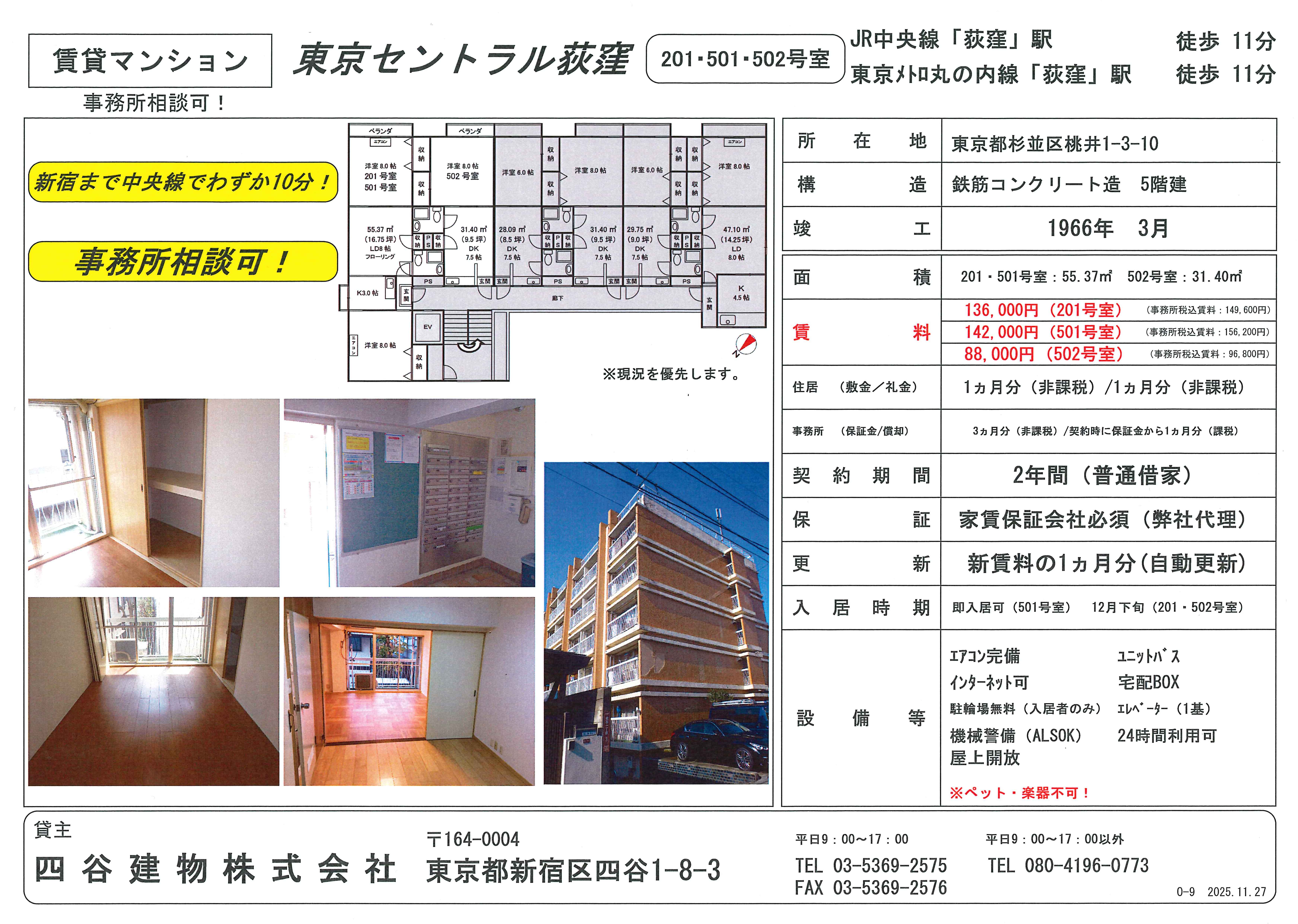 【お問い合せ】TEL:03-5369-2575 【営業時間】 9:00~17:00(土日祝休) 空室情報 ※画像を右クリックして、「新しいタブで画像を開く」から開いた画面で印刷が可能です。 東京セントラル荻窪 201・501・502号室 201号室 専有面積 55.37㎡ 賃料 136,000円(税抜) 用途 住居 ※事務所相談可 501号室 専有面積 55.37㎡ 賃料 142,000円(税抜) 用途 住居 ※事務所相談可 502号室 専有面積 31.40㎡ 賃料 88,000円(税抜) 用途 住居 ※事務所相談可 新宿まで中央線でわずか10分! 物件所在地